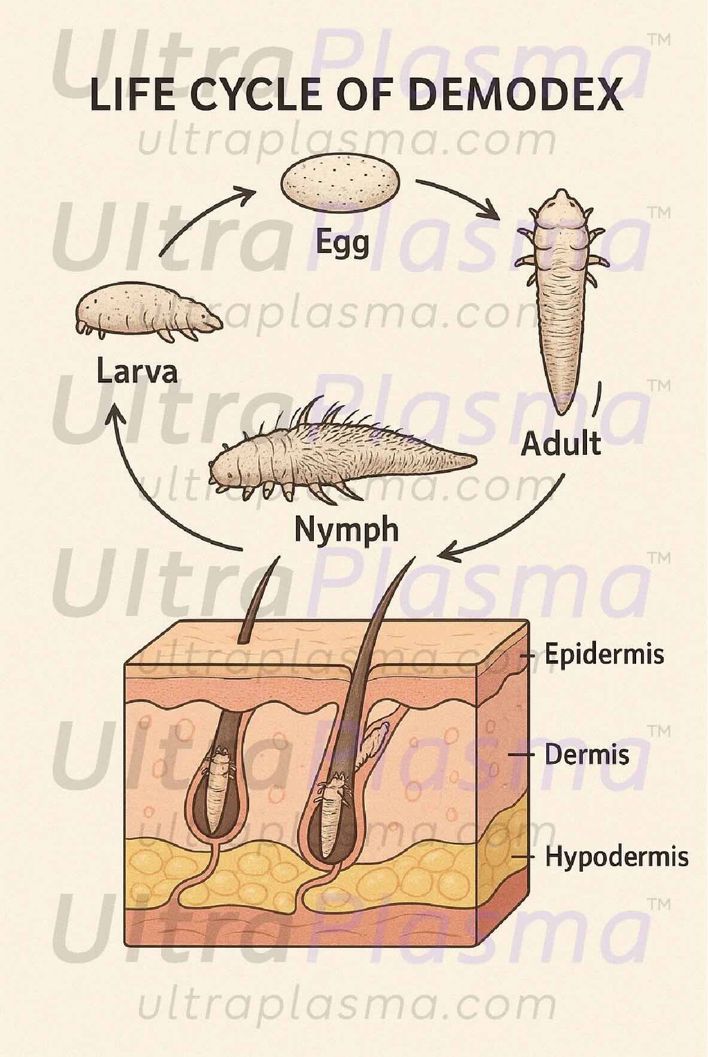 Demodex folliculorum and Demodex brevis are ubiquitous ectoparasitic mites implicated in various dermatological disorders, including rosacea, blepharitis, seborrheic dermatitis, and acneiform eruptions. Conventional treatment strategies remain limited due to recurrence and drug resistance. This article introduces a novel, multi-modal therapeutic approach using UltraPlasma™, a proprietary multi-platform plasma system integrating arc, argon, and helium plasma technologies, to eliminate Demodex mites effectively. The treatment’s success hinges on its ability to interact with epidermal, dermal, and hypodermal layers, while utilizing ozone (O₃), nitric oxide (NO), and reactive species to deliver localized microbicidal, anti-inflammatory, and immunomodulatory effects. Figures and references are provided to support the multi-layered mechanism and clinical potential.