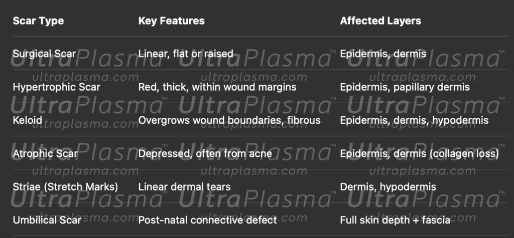 Scarring, a complex biological response to dermal injury, manifests in various forms including surgical, hypertrophic, keloid, atrophic, stretch marks (striae), and umbilical scars. Traditional treatments often fall short due to the variability in scar biology and patient response. UltraPlasma™, a next-generation dermatological technology integrating arc, argon, and helium plasma modalities, offers a multi-depth, multi-function strategy. This article explores the anatomical, biological, and engineering principles behind scar remediation using UltraPlasma™, including the effects on skin layers, reactive species interactions, and clinical applications.