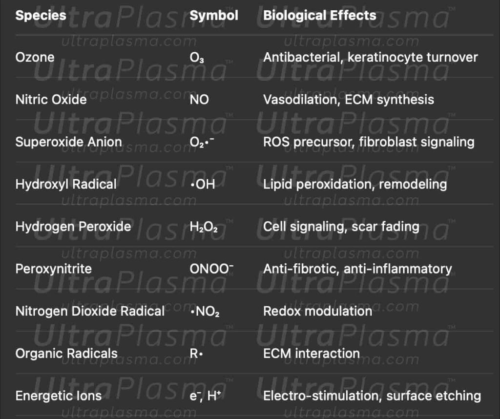 Biochemical repair: Stimulates the skin’s own signaling pathways via reactive gas species.